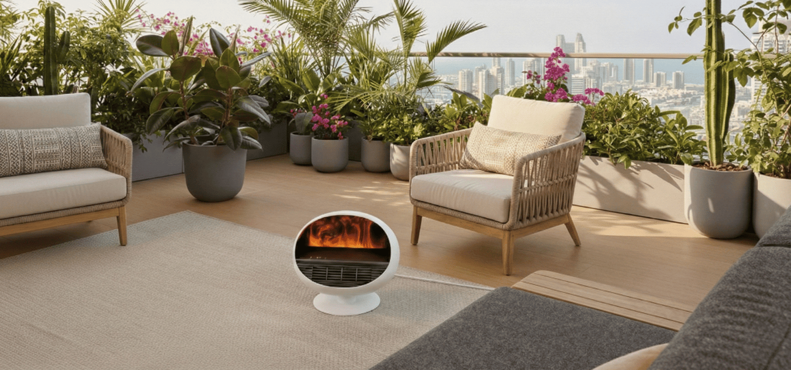 The solution: A portable warmth companion We need a pleasant temperature to feel good and extend those outdoor evenings. The solution: a small portable heater for your balcony setup. Bringing a heater into your outdoor seating area creates a pleasant zone of warmth in no time at all—so you feel cozy and able to spend more time enjoying the beautiful winter weather.